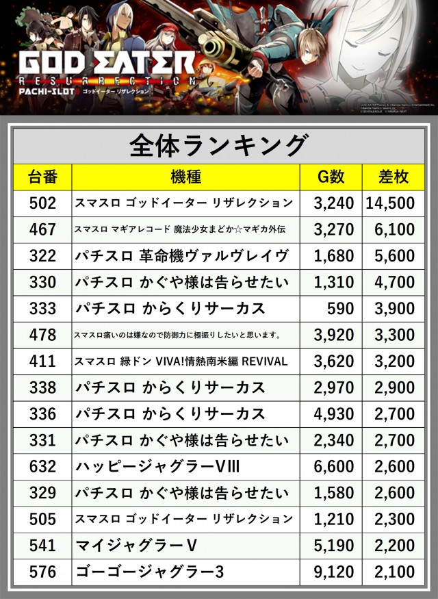 厳選された取材対象機種をはじめ、その他スロット全体から好記録が飛び出した!プレイヤーが楽しんだ1日を下記データにて振り返ってみて欲しい。