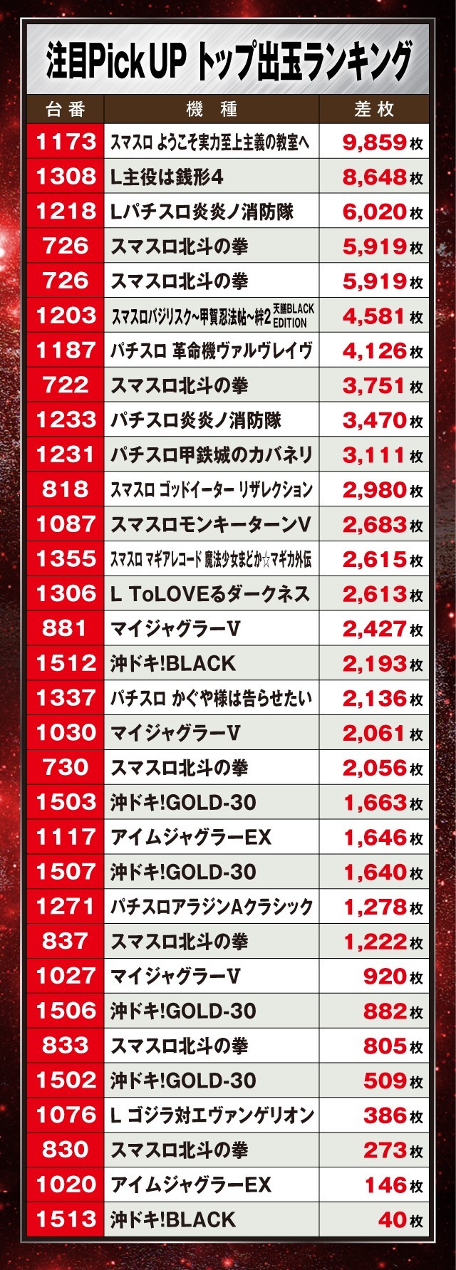 この日、最もプレイヤーの注目を集めていたのが、導入されたばかりの新台『スマスロ ようこそ実力至上主義の教室へ』で、1173番台が+9,859枚を叩き出しランキングトップに。次いで『L主役は銭形4』が+8,648枚、『Lパチスロ炎炎ノ消防隊』が+6,020枚を記録し店内を盛り上げていた。