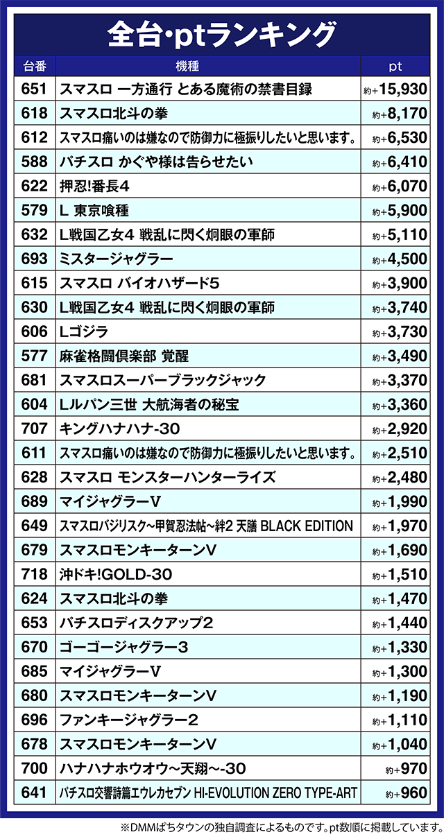 ほかにも、「スマスロ バイオハザード5」や「Lゴジラ」など、多くの台が約+3,300ptを上回った。