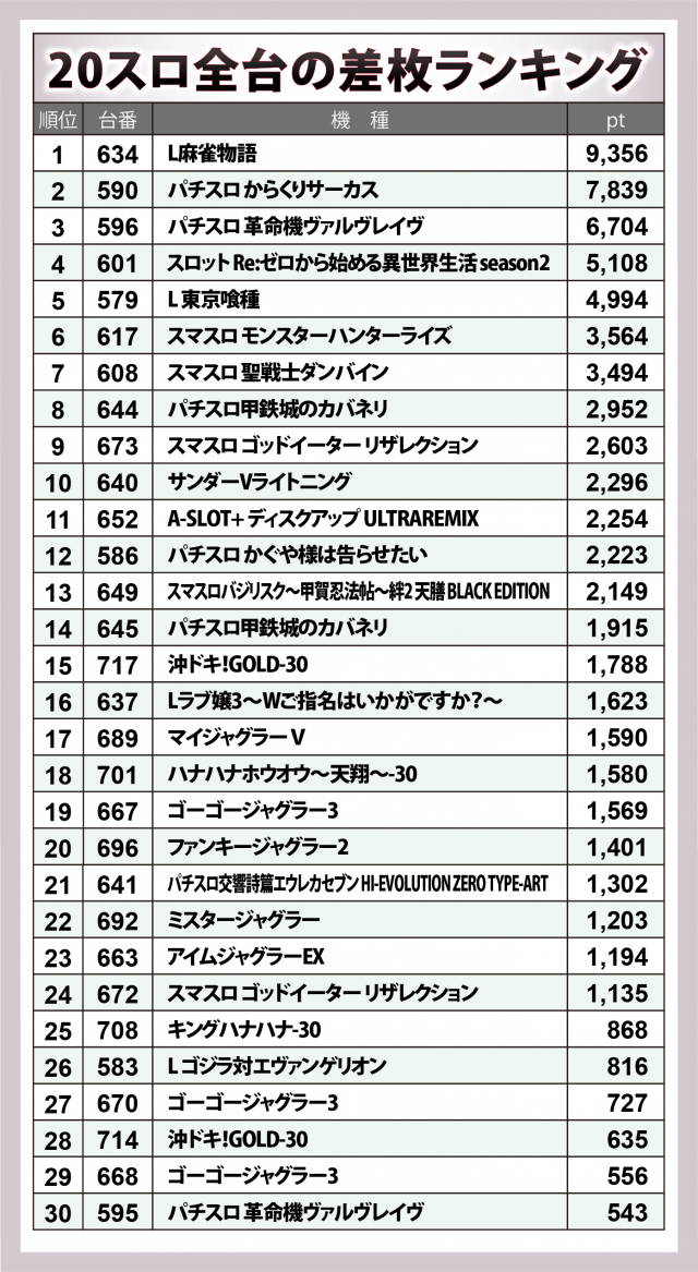 加えて、『パチスロ からくりサーカス』が+7千8百超、『パチスロ 革命機ヴァルヴレイヴ』が+6千7百超、『スロット Re:ゼロから始める異世界生活 season2』が+5千1百超と、ベテランとなるスマスロにも好出玉が認められた。