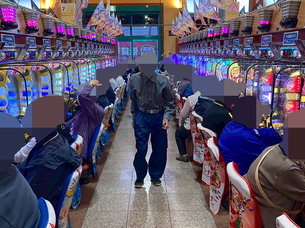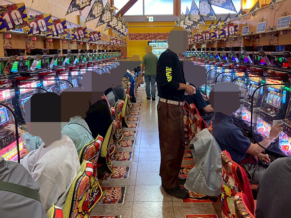 ジャグラーシリーズで構成されている1000円/46枚パチスロを見ると、ほぼ満席となるほどの人気を得ていた。