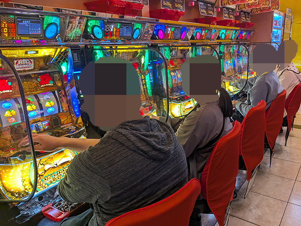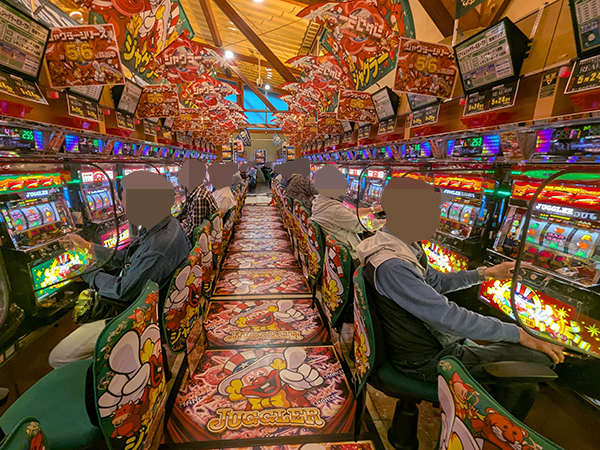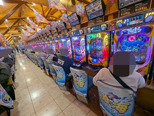 500円/89枚パチスロの稼働も高い。プレイヤーたちが楽しそうにレバーを叩く姿を目撃している。