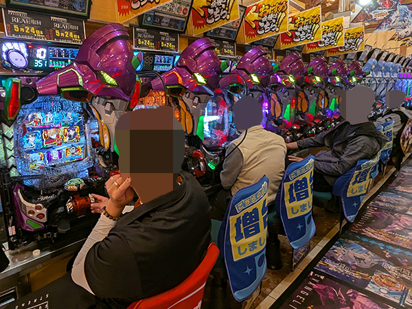 4円パチンコに目を移すと、「新世紀エヴァンゲリオン〜未来への咆哮〜」に人気が集まっており、かなりのにぎわいを見せていた。