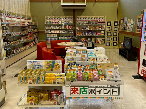 景品コーナーには来店ポイントで交換できる日用品・インスタント食品・酒類など多彩なアイテムが揃っており、プレイヤーたちの目を引いていた。