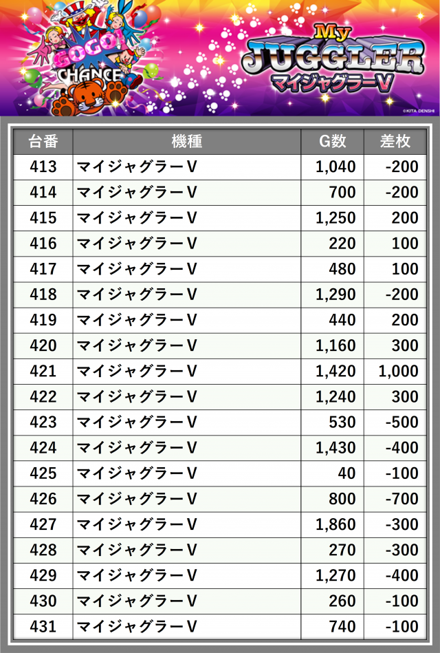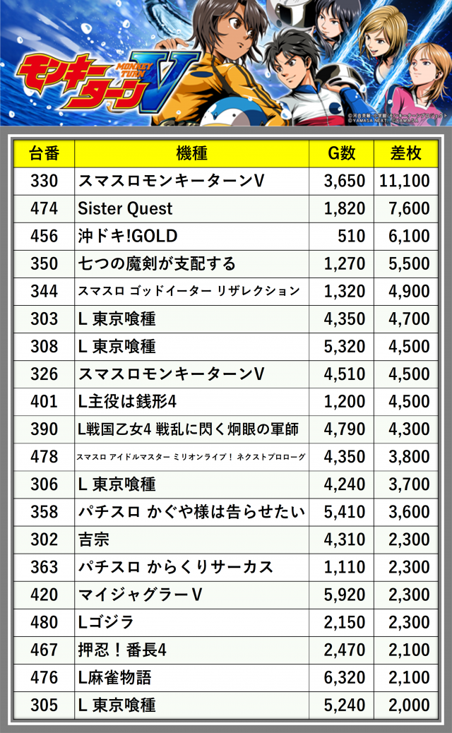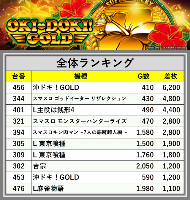 厳選された取材対象機種をはじめ、その他スロット全体から好記録が飛び出した!プレイヤーが楽しんだ1日を下記データにて振り返ってみて欲しい。
