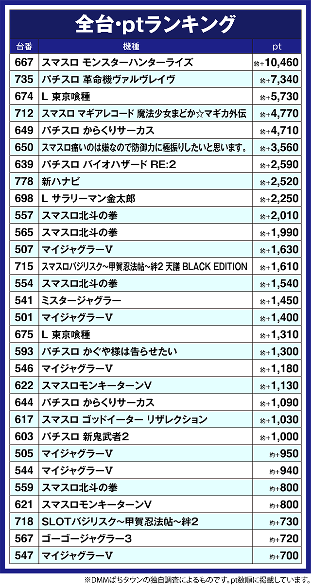 「スマスロ マギアレコード 魔法少女まどか☆マギカ外伝」の712番台や「パチスロ からくりサーカス」の649番台も約+4,700ptを上回った。