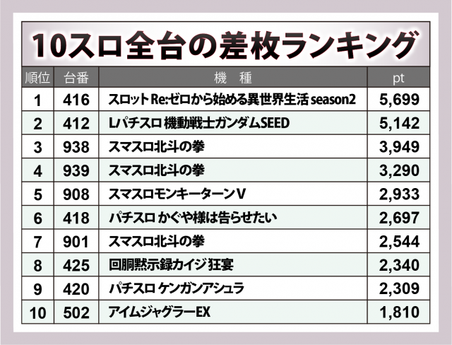 『スロット Re:ゼロから始める異世界生活 season2』が+5,700枚弱で全135台の頂点に輝き、新台の『Lパチスロ 機動戦士ガンダムSEED』も+5,100枚超と大台突破に成功した。