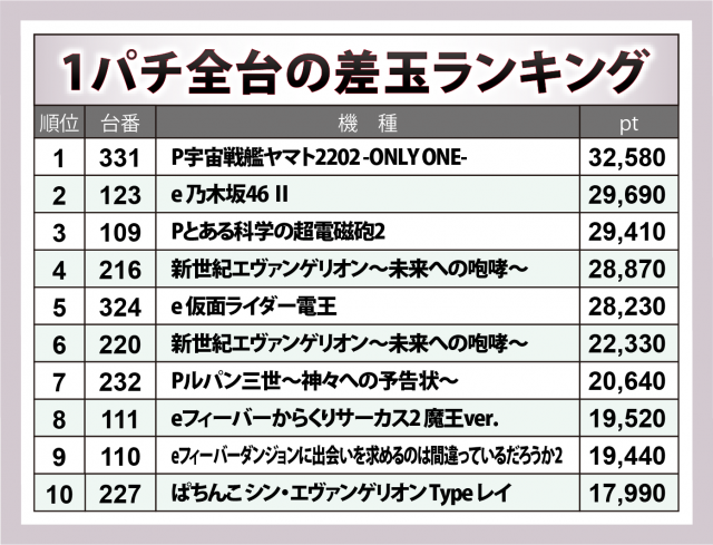 全225台の首位に就いたのが『P宇宙戦艦ヤマト2202 -ONLY ONE-』331番台で、+33,000個に迫る出玉を叩き出した。また、導入間もない『e 乃木坂46 Ⅱ』に加え『Pとある魔術の禁書目録2』と1台設置の機種、台数の多い『新世紀エヴァンゲリオン~未来への咆哮~』、双方に好出玉が認められたのは喜ばしい。