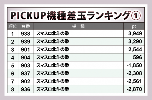 続いては『スマスロ北斗の拳』8台に注目。半数の台が勝利を収め、+3,900枚超・+3,300枚弱・+2,500枚超が1台ずつ生じ、活気のあるシマとなっていた。