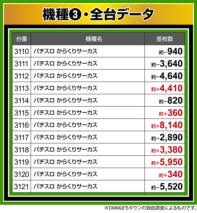 『パチスロ からくりサーカス』は6台がプラスとなり、3116番台が約+8,140pt。