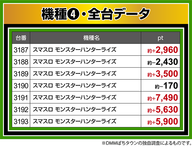 7台設置の『スマスロ モンスターハンターライズ』は、5台が約+2,900ptオーバー。
