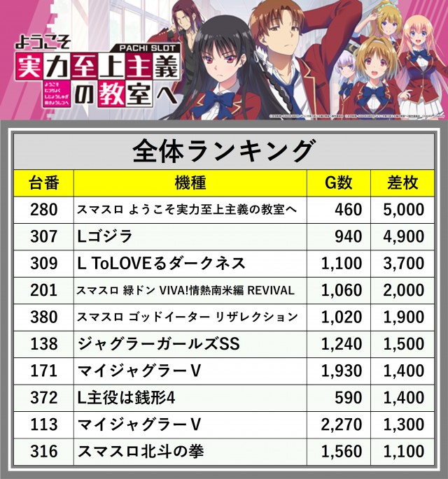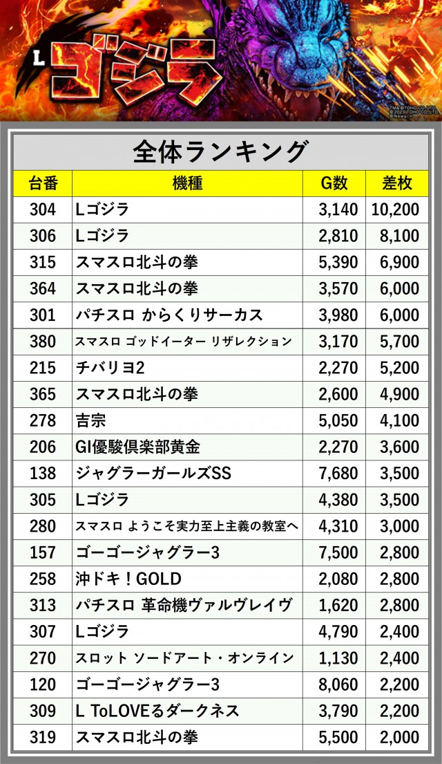 厳選された取材対象機種をはじめ、その他スロット全体から好記録が飛び出した!プレイヤーが楽しんだ1日を下記データにて振り返ってみて欲しい。