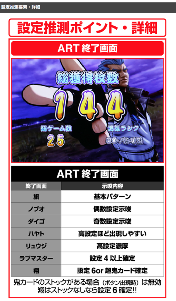 ART終了画面に出現するキャラも要チェックだ。ストックなし時に限り、ラブマスターや翔が出現で高設定の期待大。