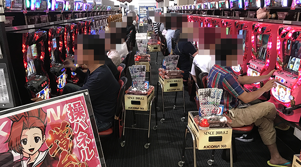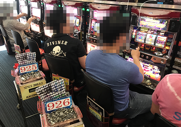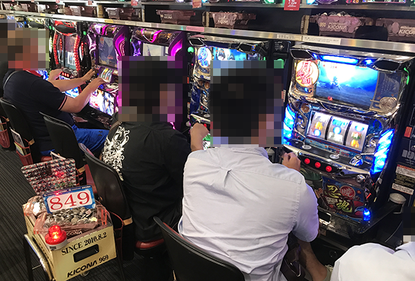 パチスロのなかで、とくに活気づいていたのが「押忍!番長3」と「バジリスク~甲賀忍法帖~絆」。プレイヤーたちは機種の特徴をうまく活かし、充実した時間を過ごせている様子であった。