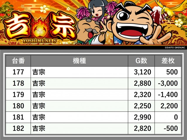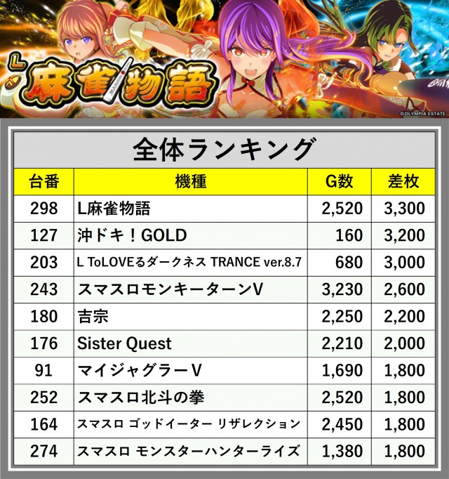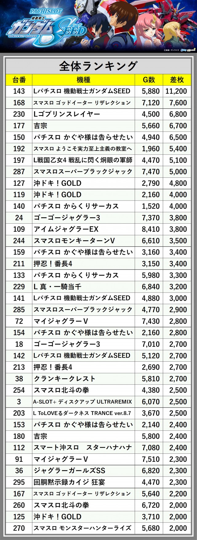 厳選された取材対象機種をはじめ、その他スロット全体から好記録が飛び出した!プレイヤーが楽しんだ1日を下記データにて振り返ってみて欲しい。