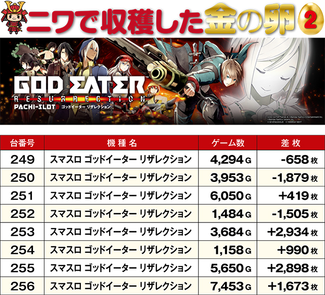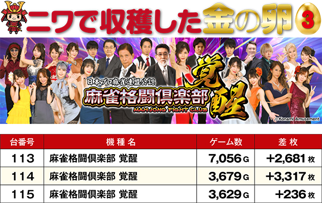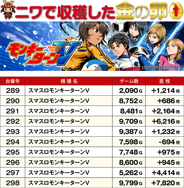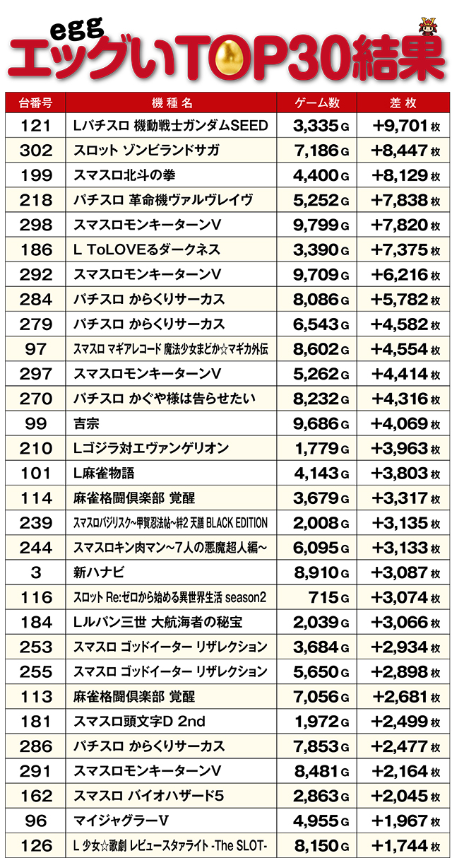 今回は惜しくも10,000枚オーバー台は現れず…。『Lパチスロ 機動戦士ガンダムSEED』が10,000枚に肉迫したものの、届かなかった。また毎度毎度、ニワ獲り合戦の日に好成績を残している『スマスロモンキーターンV』と『スマスロ ゴッドイーター リザレクション』は、この日も高いプラス率をキープ!加えて3台機種の『麻雀格闘倶楽部 覚醒』が全台プラスの快挙を達成した。