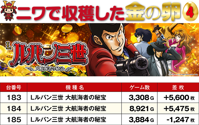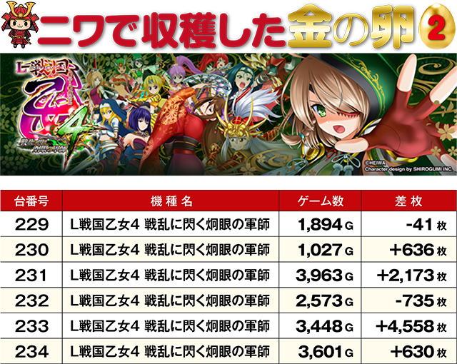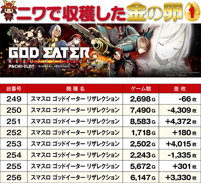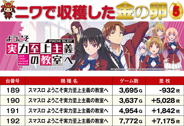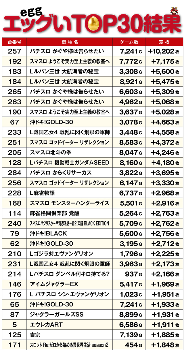 前回、TOP30入りを逃した『パチスロ かぐや様は告らせたい』が、10,000枚オーバー記録で首位の座に。各機種の動向に目を向けると、今回も『スマスロ ゴッドイーター リザレクション』は勝率が高く、メイン機としての威厳を保った。また『Lパチスロ 機動戦士ガンダムSEED』『Lルパン三世 大航海者の秘宝』『スマスロ ようこそ実力至上主義の教室へ』からもプラス台が押し寄せ、3~6台機種の強さが目立つ1日に。