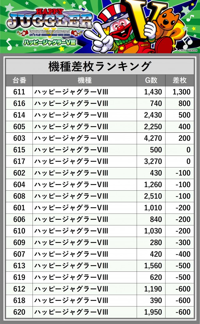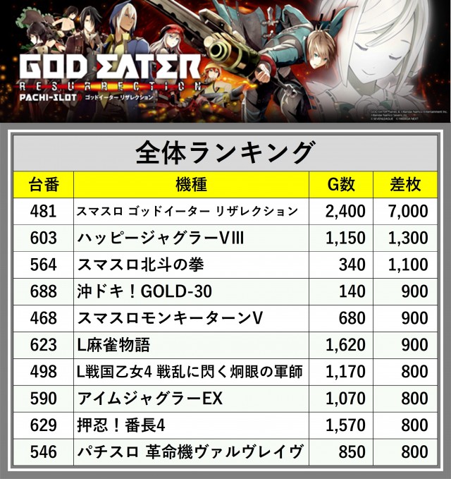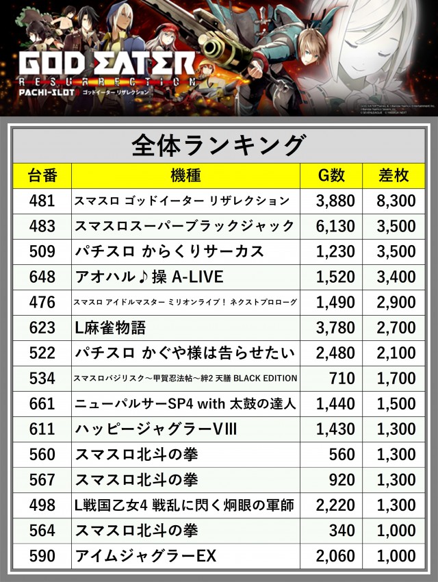 ※差枚数順に掲載しています