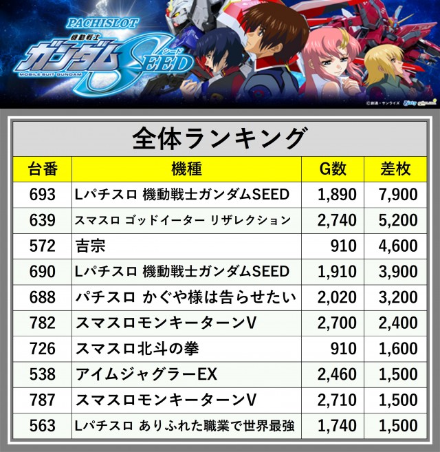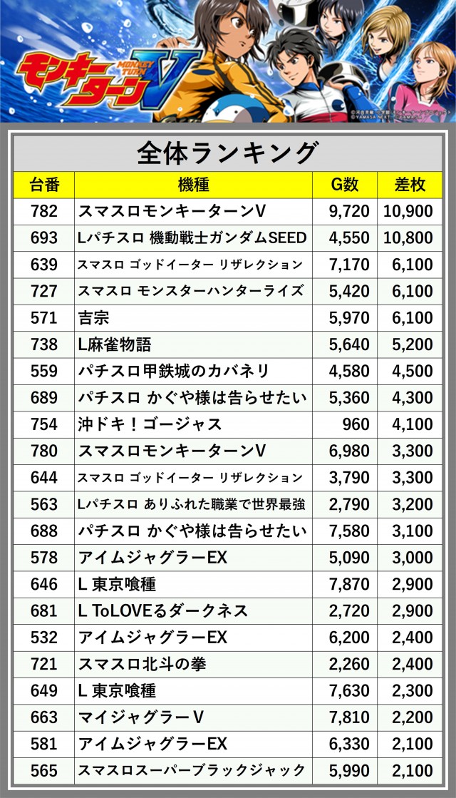 厳選された取材対象機種をはじめ、その他スロット全体から好記録が飛び出した!プレイヤーが楽しんだ1日を下記データにて振り返ってみて欲しい。