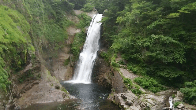 | 川沿いの遊歩道を歩いて滝つぼへ。滝つぼ手前の階段(山道)は滑りやすいため注意。歩きやすい靴で行きましょう。 |