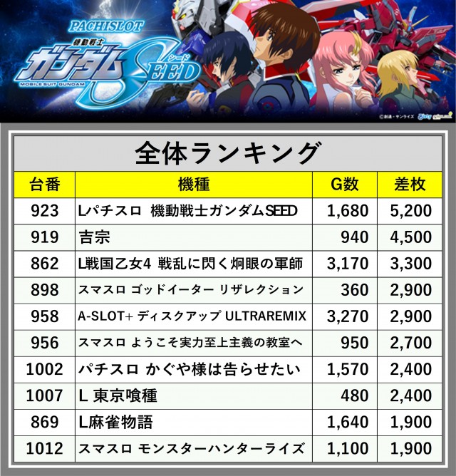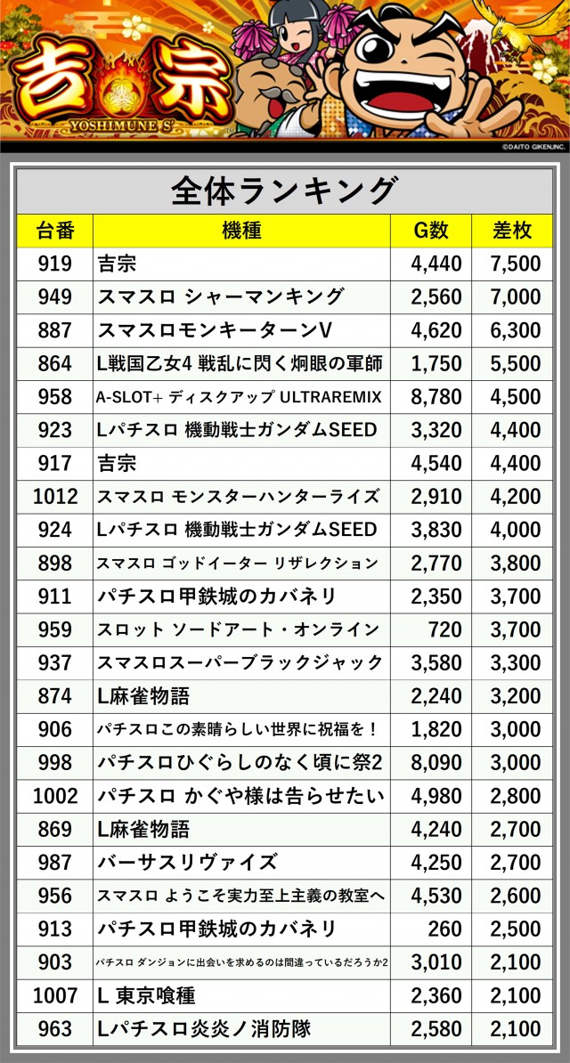厳選された取材対象機種をはじめ、その他スロット全体から好記録が飛び出した!プレイヤーが楽しんだ1日を下記データにて振り返ってみて欲しい。