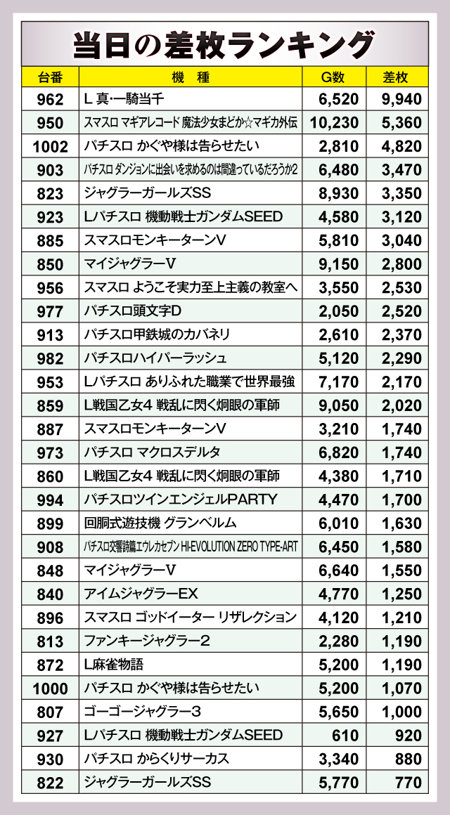 ※差枚数順に掲載しています。