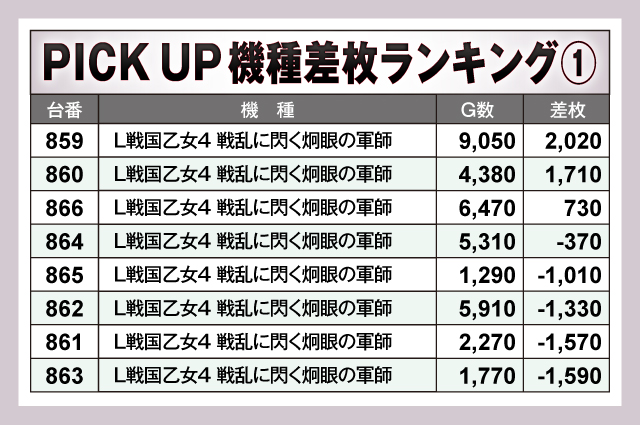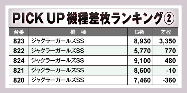『L戦国乙女4 戦乱に閃く炯眼の軍師』は8台中3台がプラス差枚。もっとも回された859番台が2,000枚を達成している。『ジャグラーガールズSS』は全台がしっかりG数を稼がれつつ控えめに終わった台も多いが、823番台は+3,350枚と立派な成績を残した。