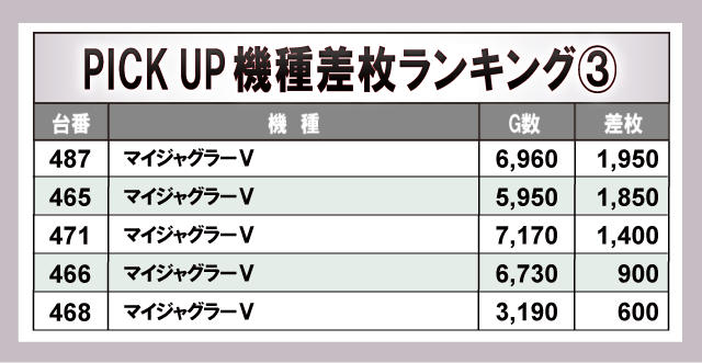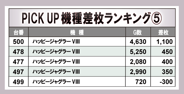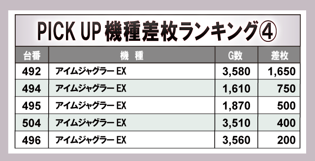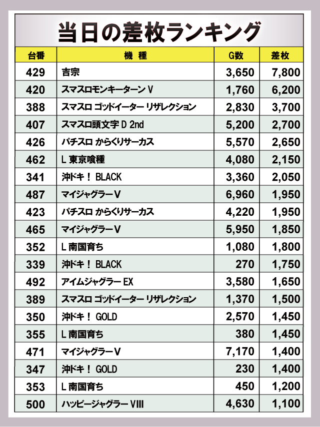 『吉宗』から+7,000枚OVER、『スマスロモンキーターンV』から+6,000枚OVERが生まれ店内の盛り上がりをリード。その他にも数多くの台がまとまった出玉を確保しており、大きな熱気に包まれていたようだ。そして上表を見ての通り『沖ドキ』シリーズや『ジャグラー』シリーズが多く名を連ねているのもポイントで、各所で打ちごたえのある状況が発生していた。