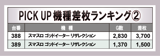 上表の優秀機種たちは、いずれもファンが手応えを感じていた様子が窺える。なかでも『吉宗』と『スマスロ ゴッドイーター リザレクション』は全台プラス差枚数を達成するなど大きな熱気が放たれていた。その他の機種も好成績を収めており、ファンは有意義な時間を過ごせたことだろう。