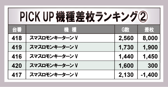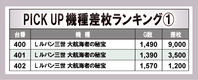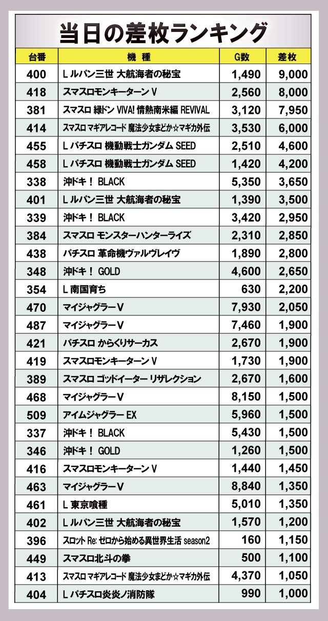 今回差枚ランキングでトップを飾ったのが『Lルパン三世 大航海者の秘宝』で+9,000枚を獲得!次いで『スマスロモンキーターンV』から+8,000枚、『スマスロ 緑ドン VIVA!情熱南米編 REVIVAL』から+7,950枚と大台突破台が多数生まれており、ファンは打ちごたえのある状況に歓喜していたはずだ!