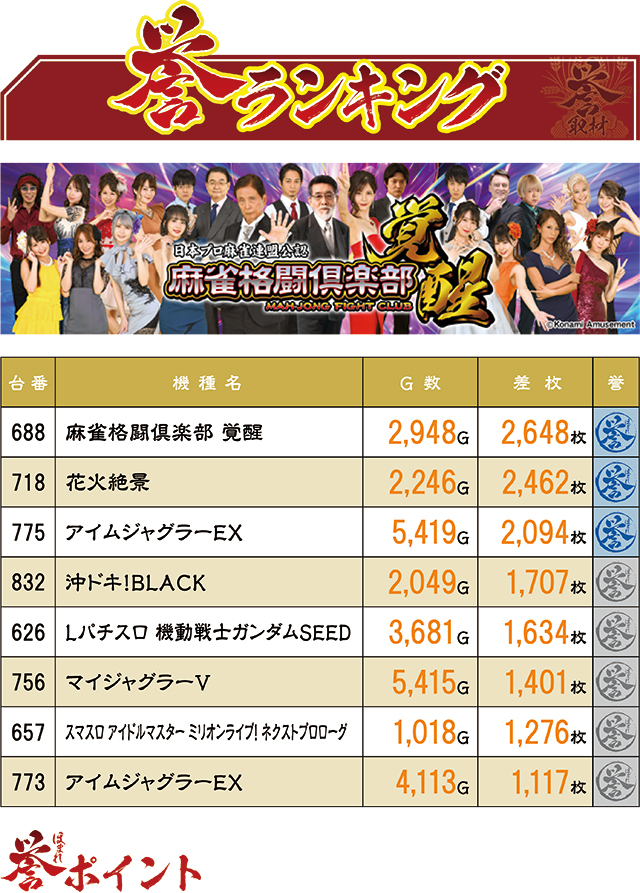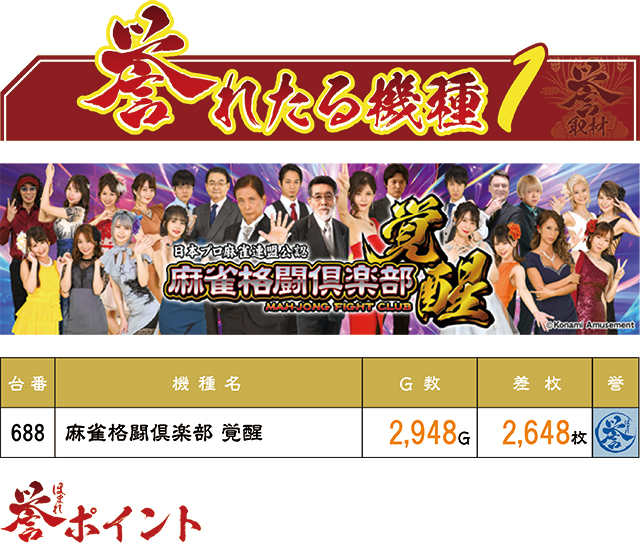 この日の1位記録となったのは、バラエティーコーナーに1台設置の『麻雀格闘倶楽部 覚醒』。まさかの機種が1位に躍り出たことに驚きを隠せないが、この台の総ゲーム数を見るとまだまだ伸び代は十分。もっとしっかり回されていたら…!
