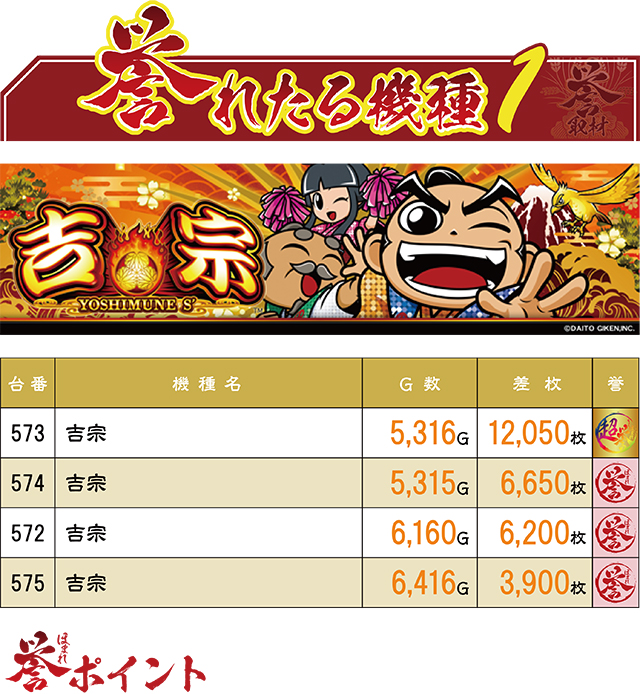 前回も3台の赤誉マーク(=3,000枚以上)を生み出していた『吉宗』。今回もその勢いに衰えは見えず、12,000枚超えレコードを含む4台が3,000枚オーバー記録を樹立した。この様子では次回も活躍を見せてくれる…!?