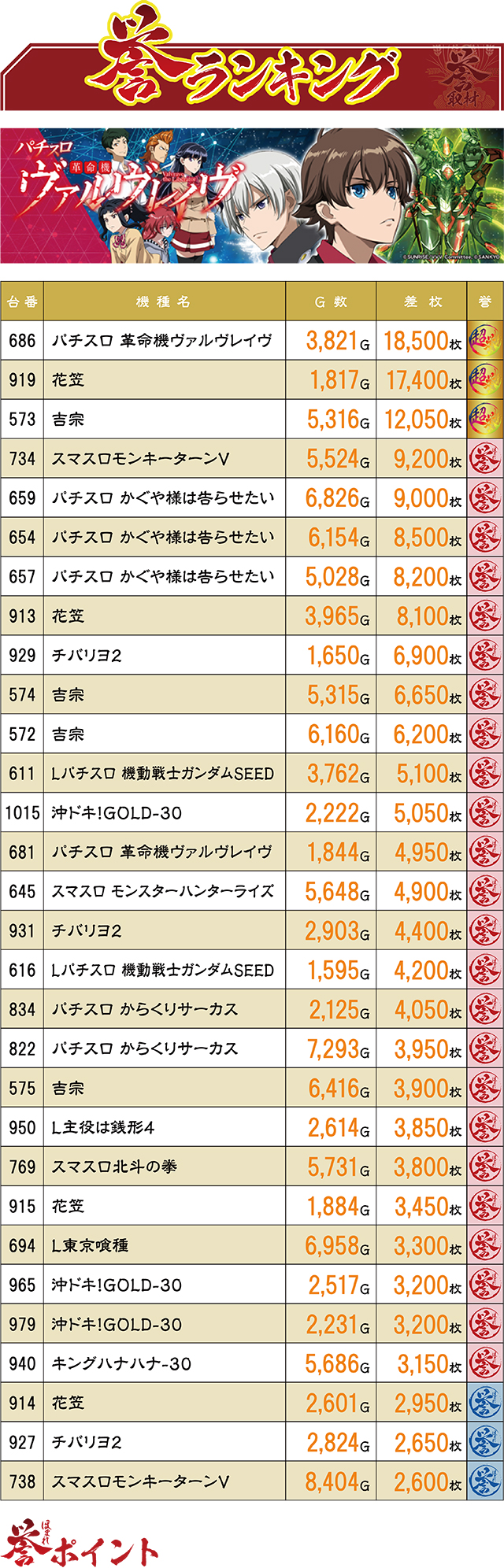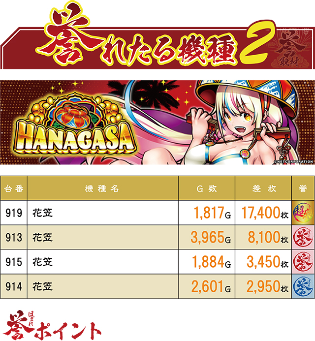この日は10,000枚オーバー記録が3台も出現!その中には全国的に導入数の少ないレア機種の『花笠』も含まれており、常連さんたちを驚かせていた。また今回は全体的にプラス差枚の台が多かったようで、TOP30記録の全てが青誉マーク(=2,000枚以上)を上回る結果に。