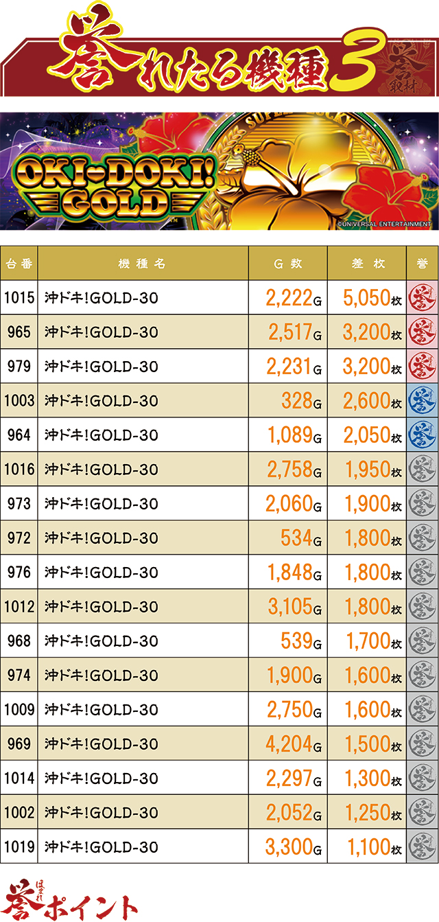 設置の約半数近くが誉レコード(=1,000枚以上)となっていたのは、パチスロコーナーで2番目に設置台数の多い『沖ドキ!GOLD-30』。3,000枚オーバー記録は3台に留まったものの、プラス台の多さには沖ドキファンも納得したことだろう。