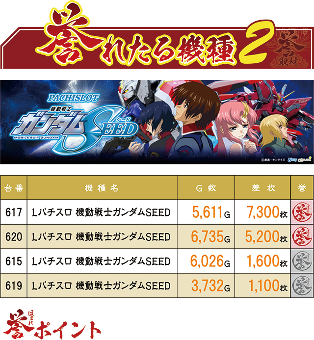 前回、誉ランキング1位記録を奪取し、圧倒的な存在感を披露した『Lパチスロ 機動戦士ガンダムSEED』がこの日も大活躍!4台が誉レコード(=1,000枚以上)となっており、特に赤誉マークの2台は挙動もかなり優秀だったようだ。