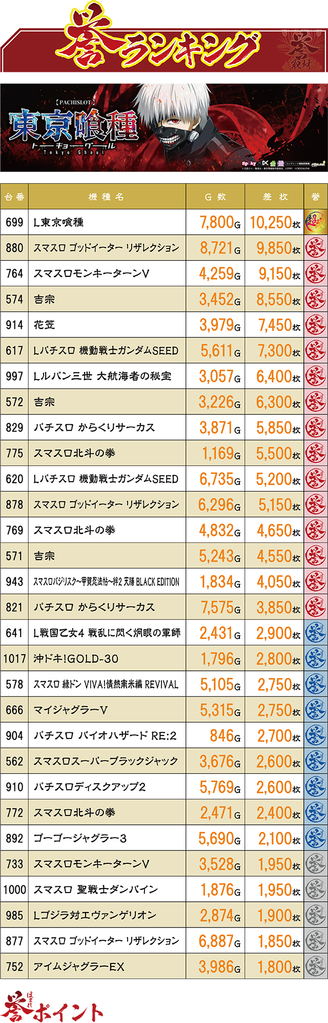 今回誉ランキングの頂点に君臨したのは、この日唯一の10,000枚超えを達成した『L東京喰種』だった。2位以下にはおなじみの人気マシンたちが並ぶ中、5位には全国的にあまり導入されていないレアマシン『花笠』がランクイン!レアマシンゆえそのポテンシャルは謎に包まれていたが、同店がそのポテンシャルの高さを証明してくれた。