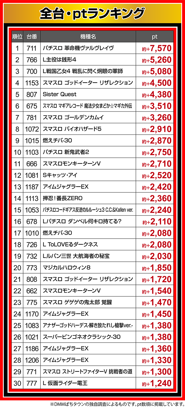 結果を残した台はほかにもあり、『燃えチバ-30』の1015番台や『パチスロ 新鬼武者2』の1103番台などが約+2,000ptを上回った。