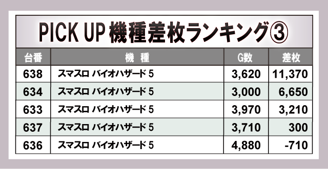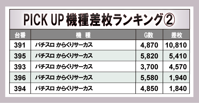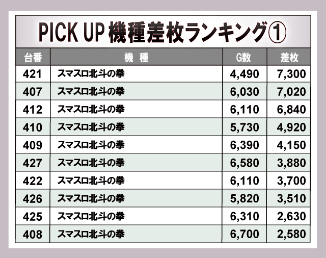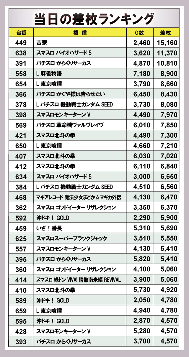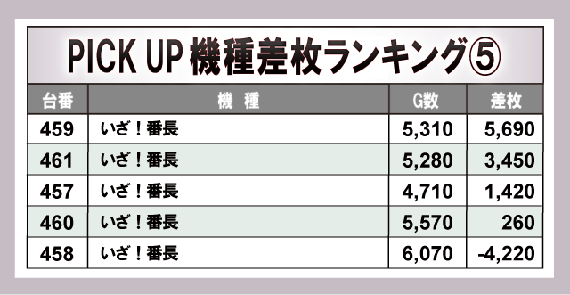 上表の8機種はいずれも活気と熱気に溢れており、当日の店内を盛り上げる存在になっていたのは間違いない。『スマスロ北斗の拳』は10台以上のまとまった出玉を確保しており、安定した結果を残していることがわかる。新台『いざ!番長』も5台中4台がプラス差枚をマークし、さっそく優秀機種として活躍を披露。上表を見ての通り、良い内容であったことから、AT機・ノーマル機のどちらにもチャンスが用意されていた!