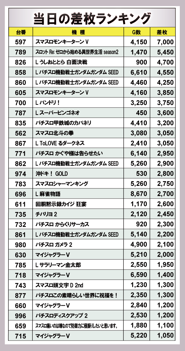 優秀台に目を通してみると、差枚数で大きな数字を打ち立てたのが『スマスロモンキーターンV』で+7,000枚OVERを記録!それに続き『スロット Re:ゼロから始める異世界生活 season2』から+5,000枚OVERをマークし、大きな熱量が確認できた。 そのほかスマスロ人気機種が中心となって盛り上がりを形成しており、各所でファンが笑顔を浮かべる光景が広がっていた。