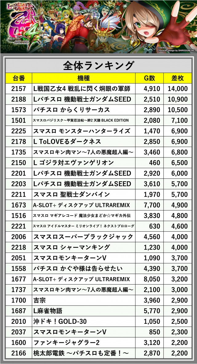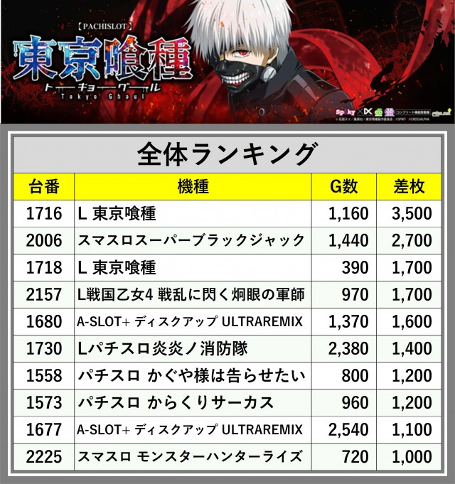 厳選された取材対象機種をはじめ、その他スロット全体から好記録が飛び出した!プレイヤーが楽しんだ1日を下記データにて振り返ってみて欲しい。
