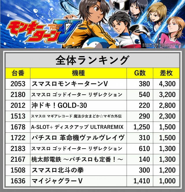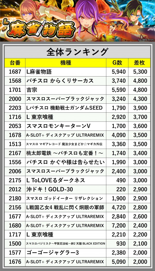厳選された取材対象機種をはじめ、その他スロット全体から好記録が飛び出した!プレイヤーが楽しんだ1日を下記データにて振り返ってみて欲しい。