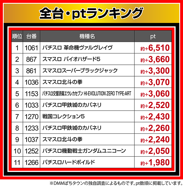 ほかにも、『戦国コレクション5』の1270番台や『パチスロ機動戦士ガンダムユニコーン』の1252番台が約+2,000ptを上回った。