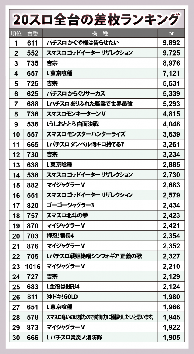 最初のチェックは[1000円/46枚]スロから。上位30台の成績を見ていこう。