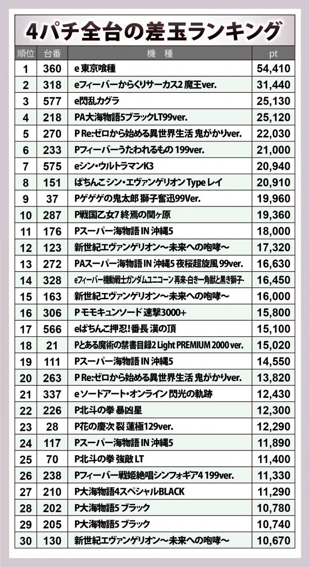 全277台の王座に就いたのは『e 東京喰種』360番台。+54,400個超のビッグヒットを果たした。