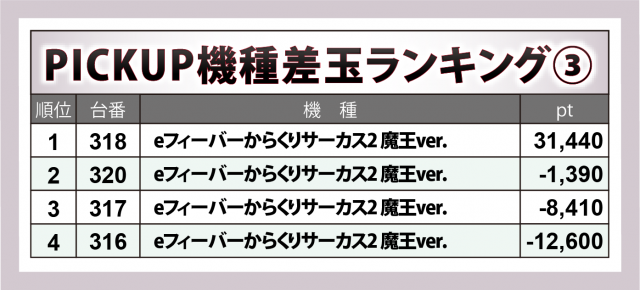 設置4台の『eフィーバーからくりサーカス2 魔王ver.』はプラス率こそ振るわなかったが、318番台が+31,400個超の数値を計上。