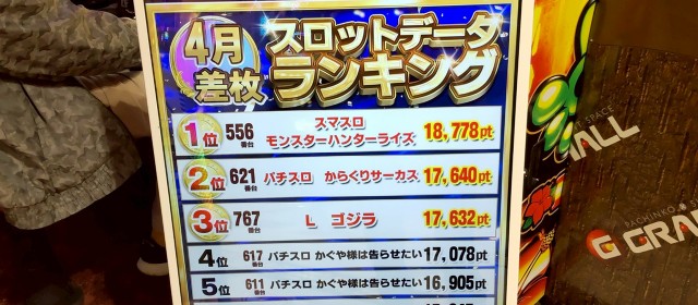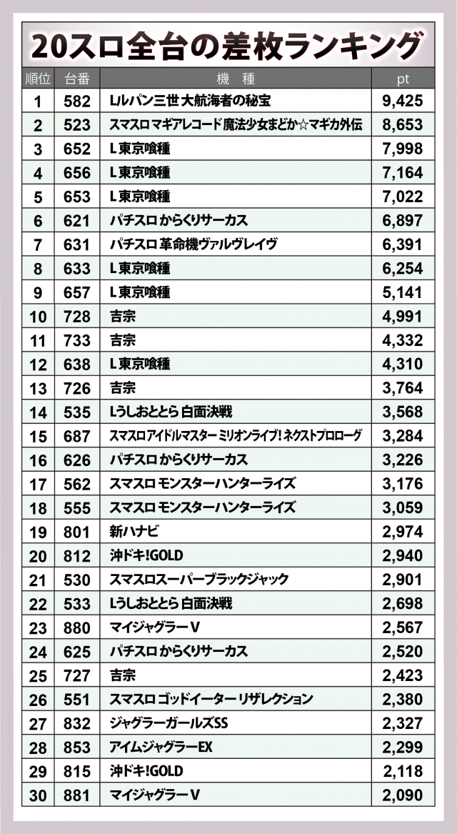 その後には『スマスロ マギアレコード 魔法少女まどか☆マギカ外伝』の+8,700枚弱、『パチスロ 革命機ヴァルヴレイヴ』の+6,400枚弱、『吉宗』では+5,000枚弱・+4,300枚超・+3,800枚弱が1台ずつと、新旧スマスロが好記録を残した。
