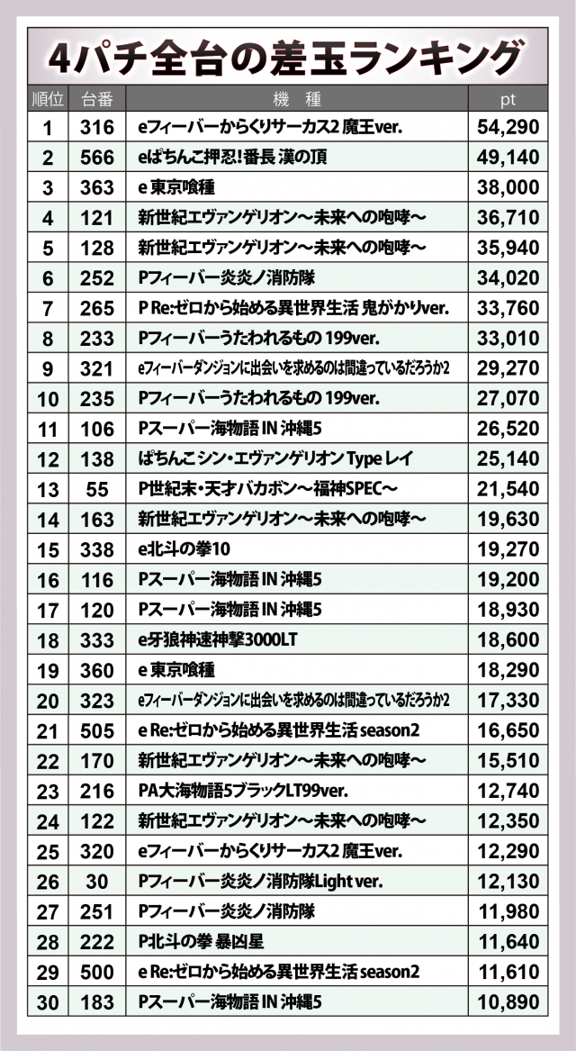 4パチもパチスロ同様に30台ランキングを公開。