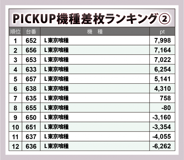 初日の調査から数々の大量獲得を成し遂げてきた『L 東京喰種』はまたもや優秀台を量産。+8,000枚弱・+6,300枚弱・+5,100枚超・+4,300枚超が1台ずつ&+7,000枚超が2台と、重量級の出玉がズラリ。