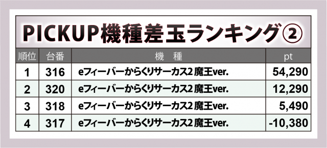 +54,300個弱の大台に到ったのは『eフィーバーからくりサーカス2 魔王ver.』316番台。2日続けてホームラン級の出玉をかっ飛ばした。また4台中3台がプラスと勝率も高かった。