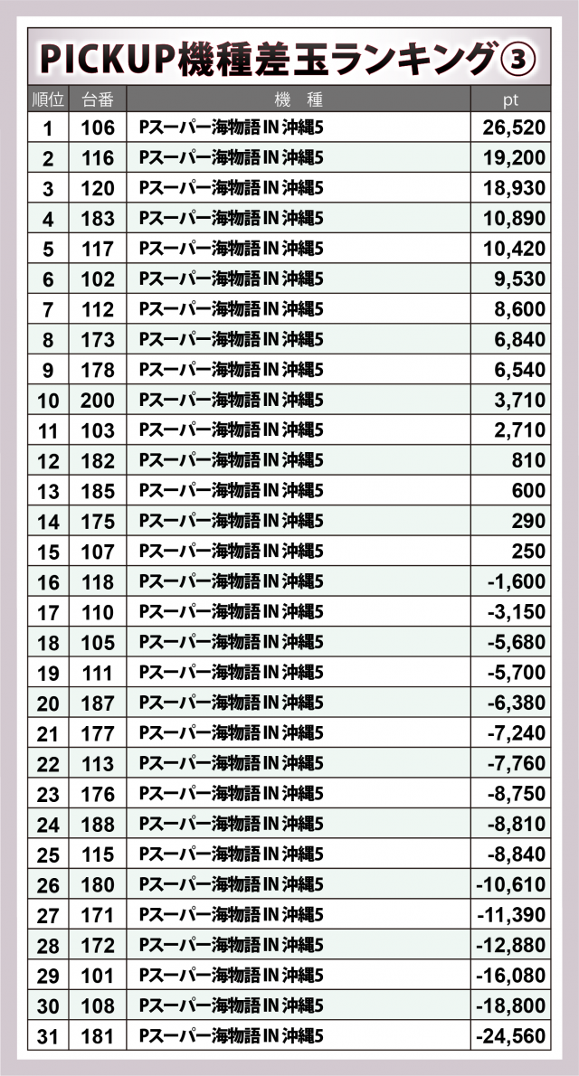 『Pスーパー海物語 IN 沖縄5』31台は半数弱が勝利し、5桁プラスは5台。106番台が+26,500個オーバーでシマの頂点に輝いた。
